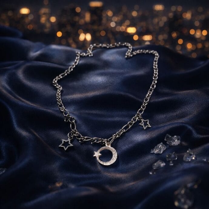 طوق جنزير فضي ناعم بتعليقات الهلال والنجوم المتميزةجديد