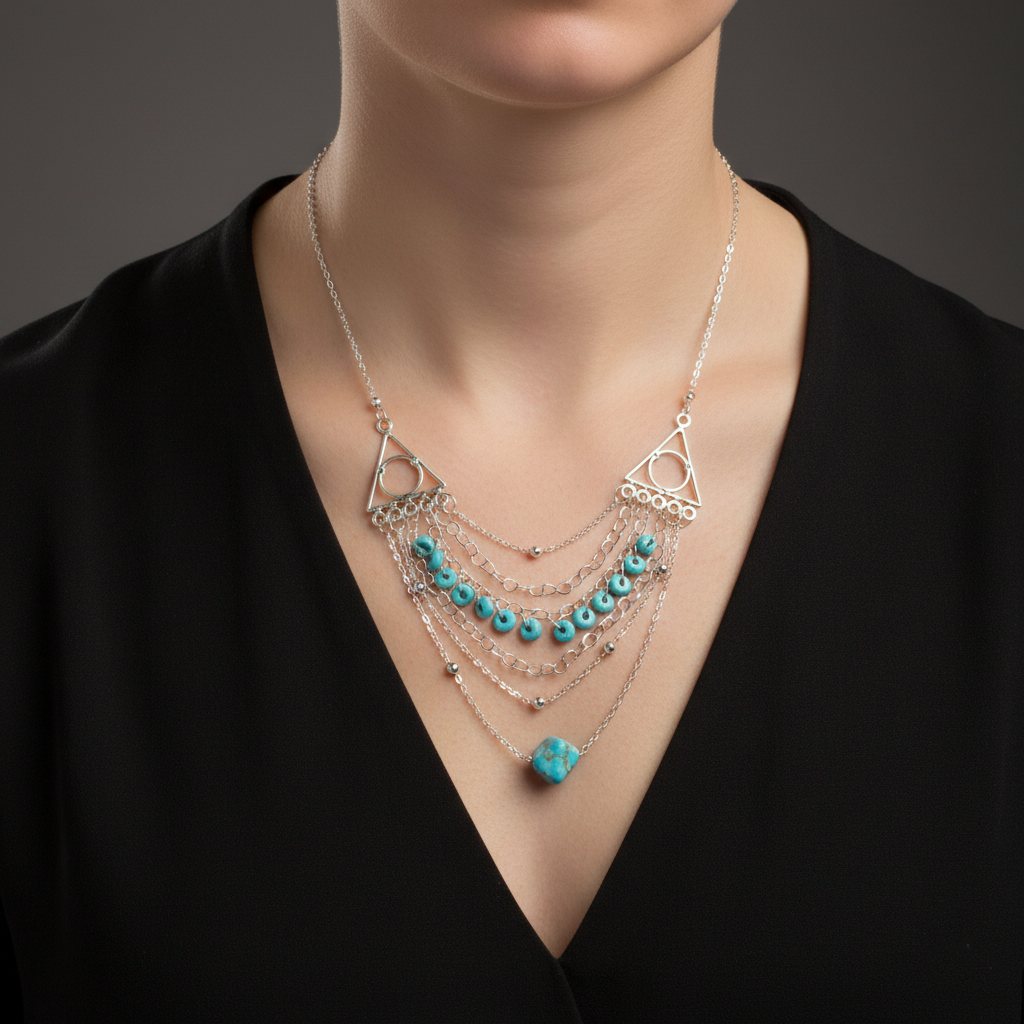 طوق بتصميم يدوي يجمع بين الأناقة والحرفية، يتميز بسلاسل متعددة الطبقات تتناغم مع الأحجار الفيروزية لتمنح القطعة حركة ناعمة وبريقًا جذابًا. تصميمه اللافت يبرز جمال الرقبة ويجعل الإطلالة أكثر تميزًا، ليكون خيارًا مثالياً لمن تبحث عن إكسسوار مختلف يلفت الأنظار. مقدمة لكم من (Maram Bracelet)🌷
