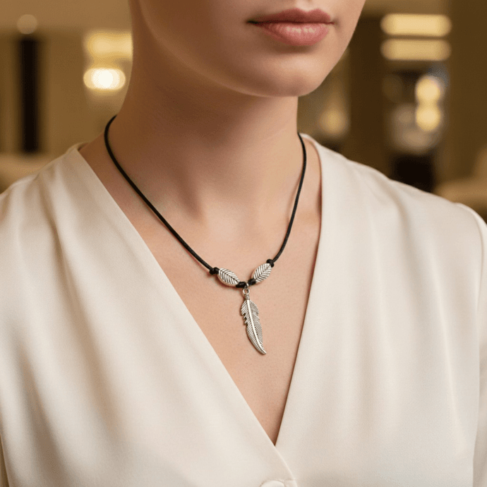 طوق خيط مع تعليقتين ورق شجر وريشة فضية ناعمجديد