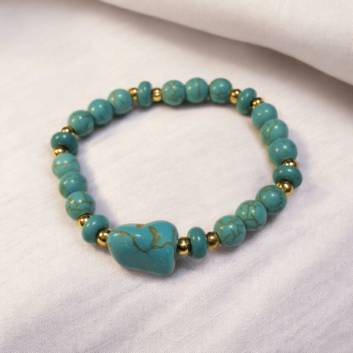 تتميّز هذه الأسوارة بتصميم ناعم يجمع بين خرز الفيروز المتناسق وتفصيلة القلب في المنتصف التي تضيف لمسة أنثوية بسيطة. اللمسات الذهبية الصغيرة تكمل الشكل العام وتمنح الأسوارة توازنًا أنيقًا دون مبالغة، ما يجعلها قطعة سهلة التنسيق مع الإطلالات اليومية والكاجوال.